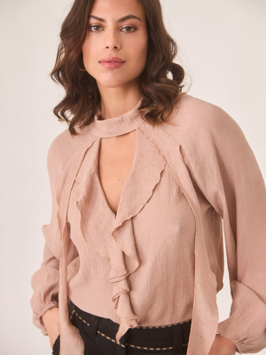 BLUSA DE VISCOSA CON CUT OUT EN ESCOTE Y VOLANTES