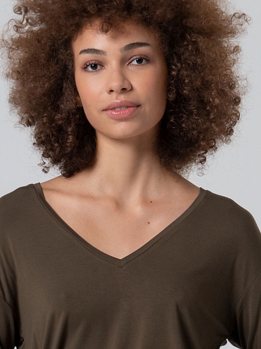 CAMISETA ESCOTE V DE VISCOSA BAMBÚ KAKI OSCURO