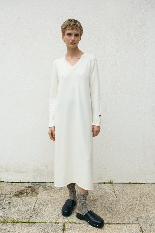 VESTIDO CUELLO PICO BOTÓN ABOLLADO ALGODÓN