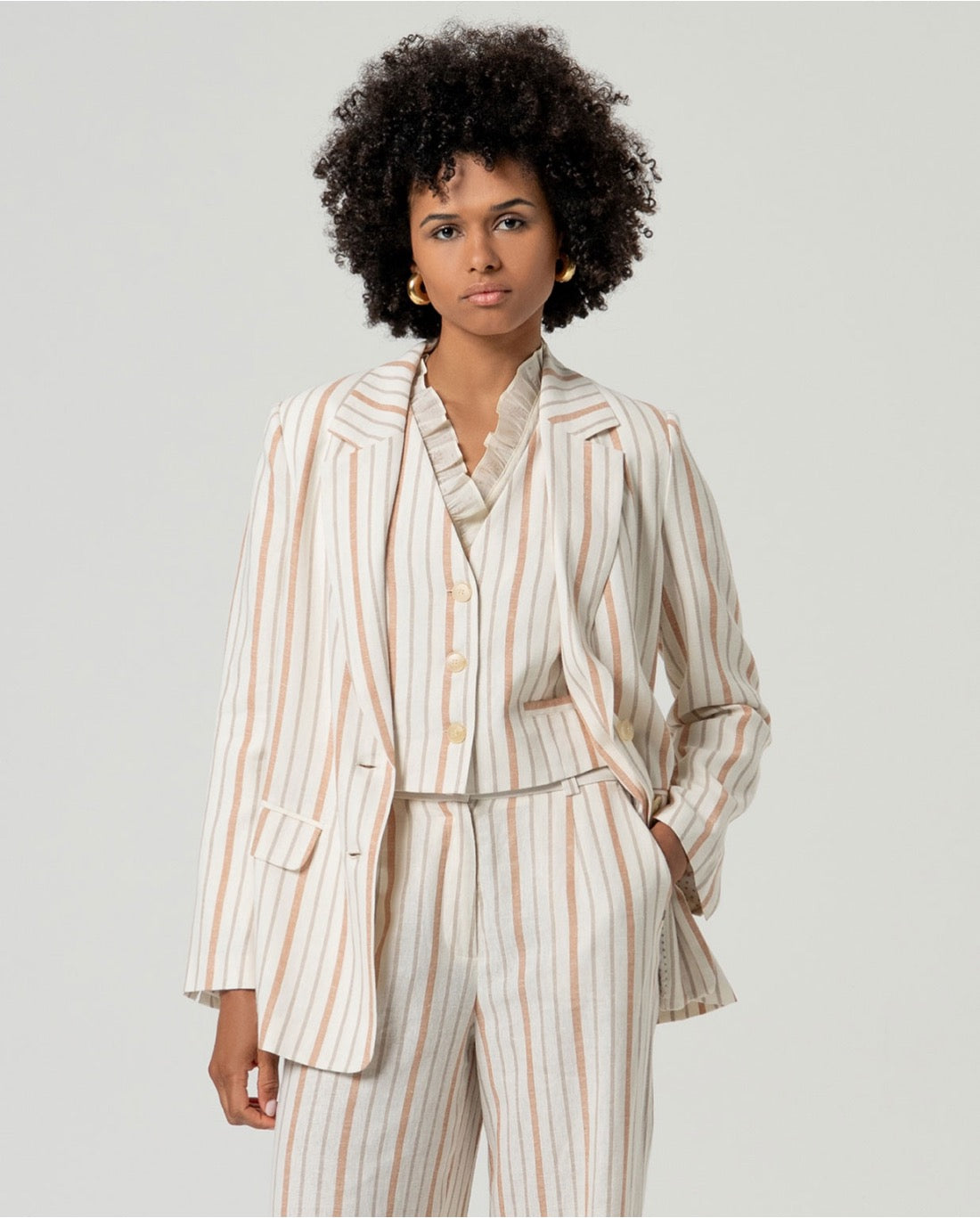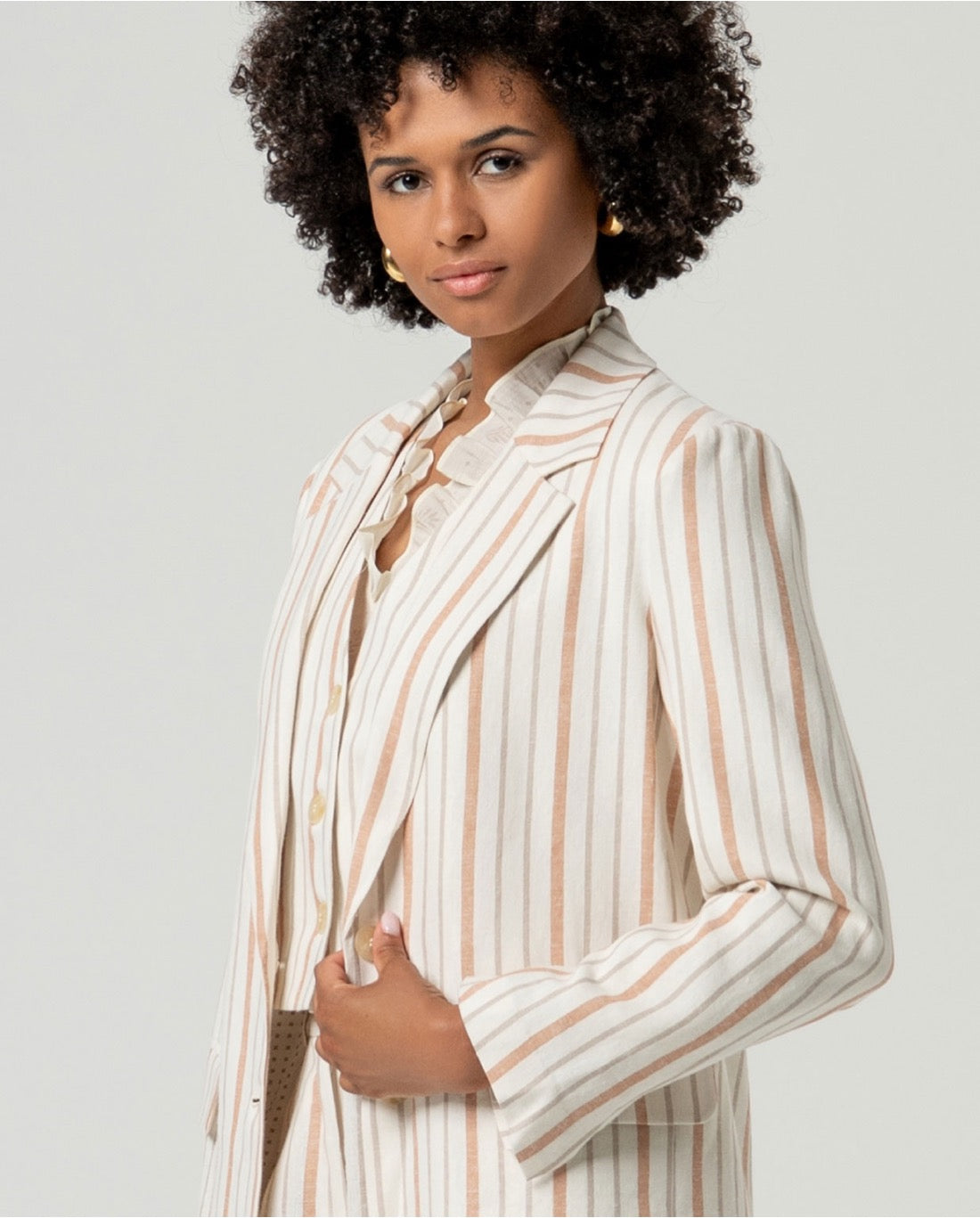 Americana con cuello solapa y manga larga. Diseño recto con estampado de rayas verticales, cierre frontal de botones y bolsillos de solapa. Confeccionada en tejido ligero con lino y algodón.