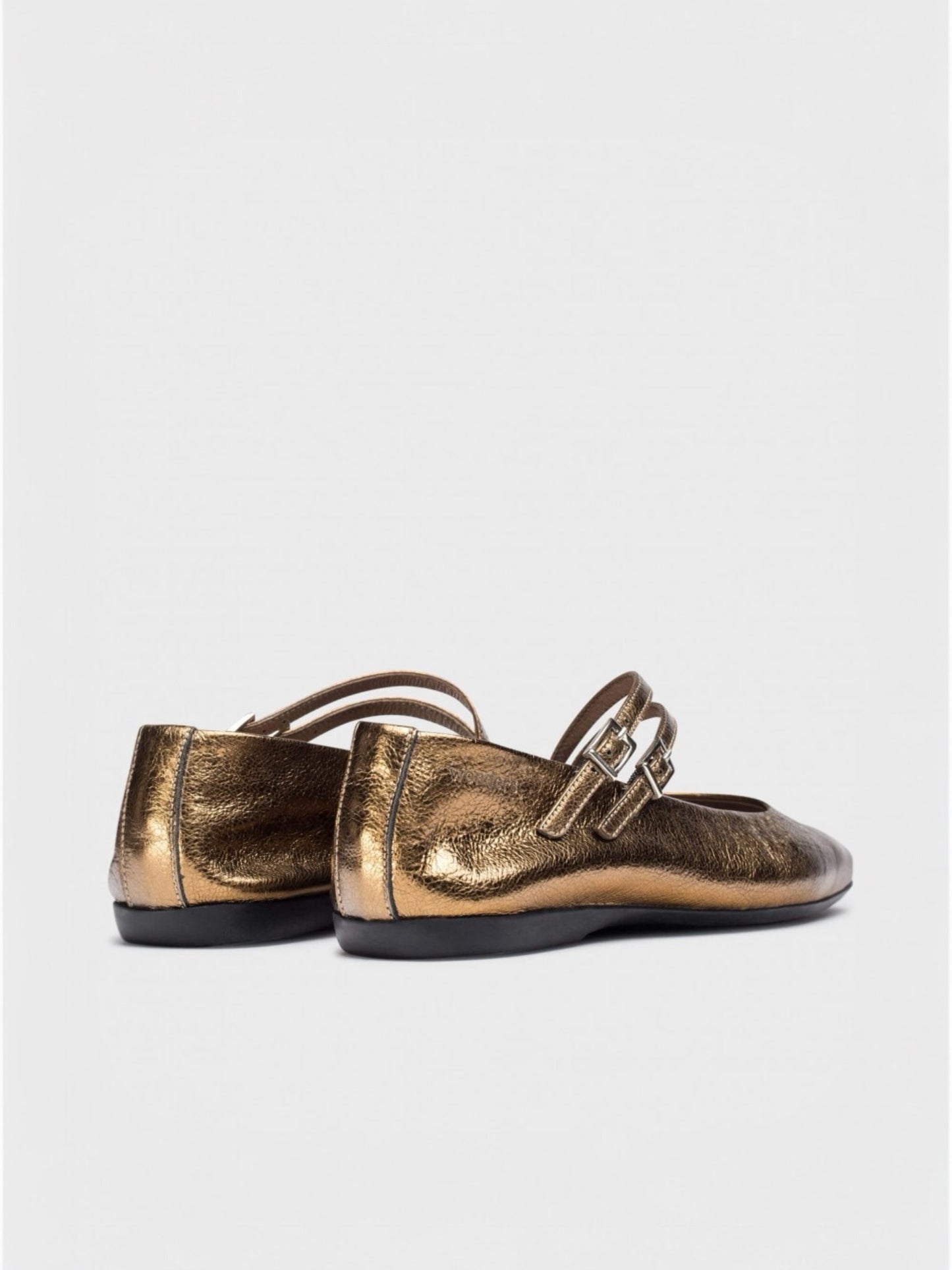 Fabricada en España, la bailarina EIDER en piel metálica oro combina diseño y confort. Sus dos tiras cruzadas en el empeine ofrecen un ajuste perfecto y un toque sofisticado. La plantilla MemoryGel garantiza una pisada suave y amortiguada. Diseño exclusivo y fabricación responsable.