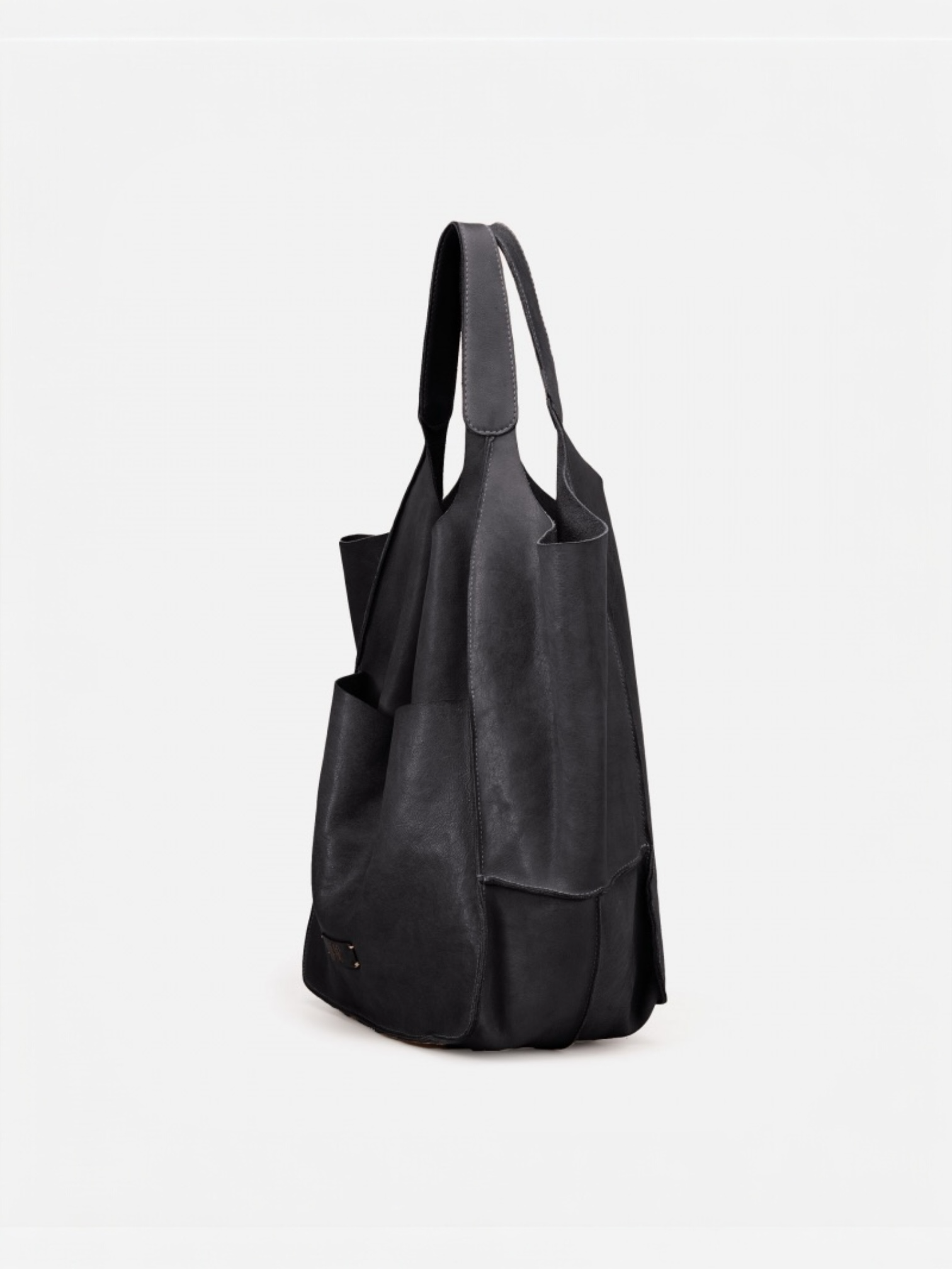 Shopper de piel vacuna lavada, y de curtición vegetal. Cierre con botón.