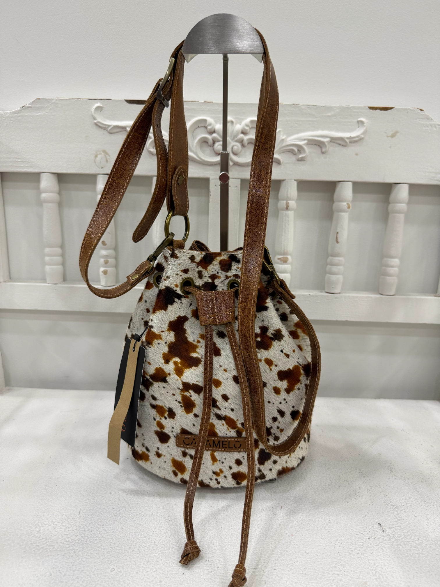 Bolso tipo saco de piel en animal print vaca por la parte delantera, la parte trasera en cuero.