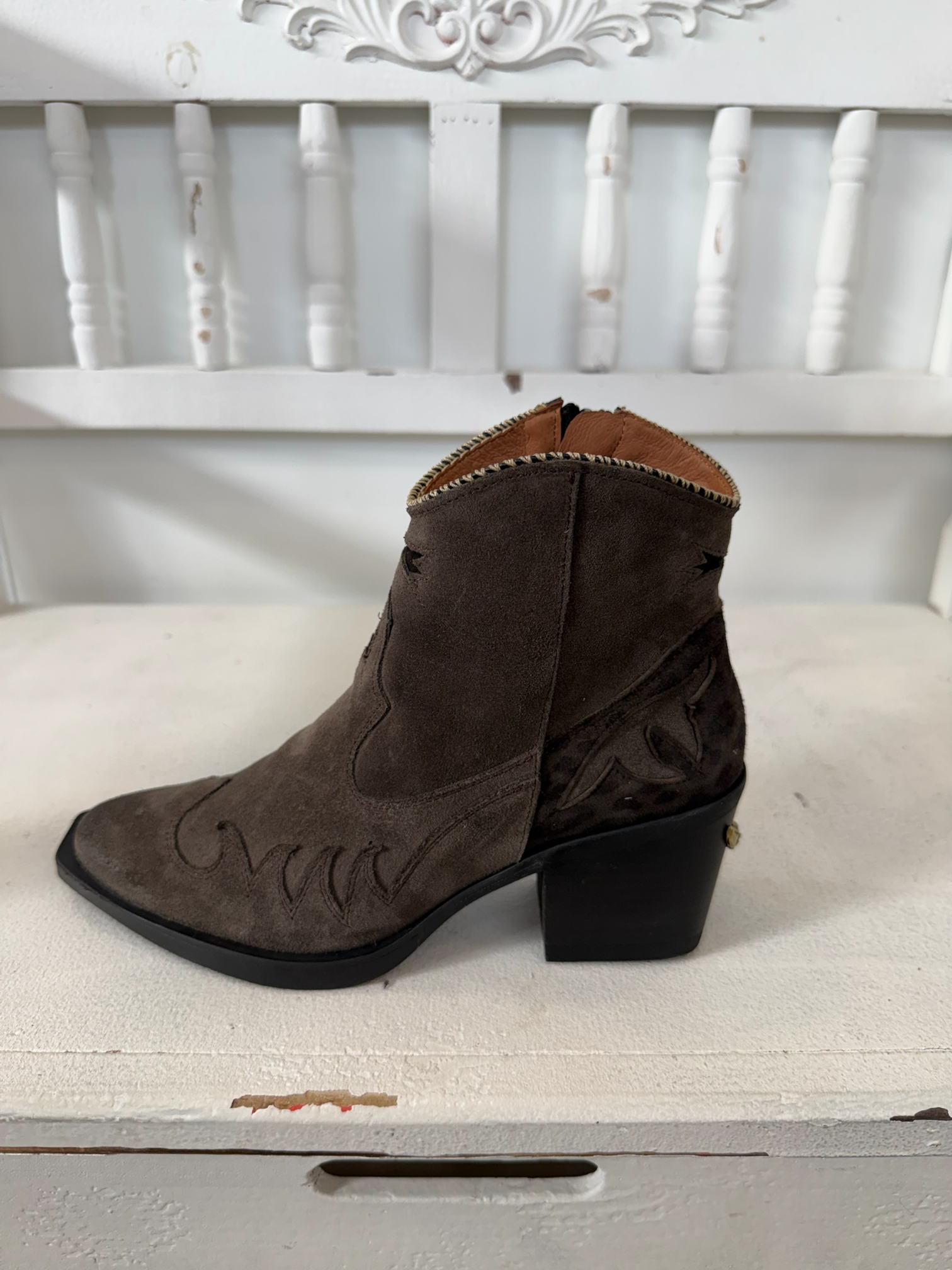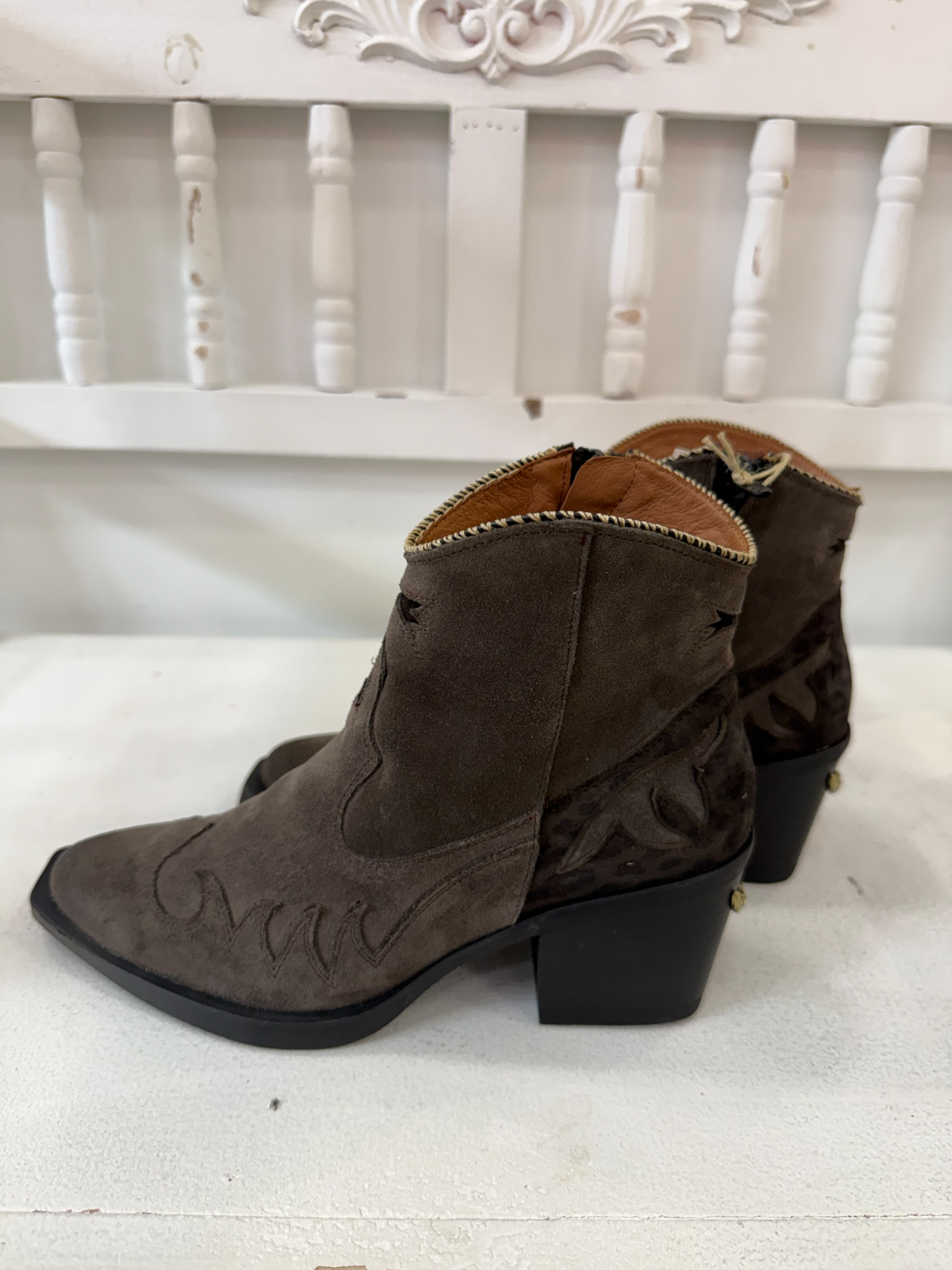 Botines cowboy Boho Chic en piel en color gris oscuro combinado con detalles en relieve y pequeñas manchas grises en la parte trasera del botín y con el logo de la marca sobre el tacón, con un tacón medio y cremalleras laterales para mayor comodidad, horma súper cómoda es un diseño exclusivo de la firma española Nemonic.