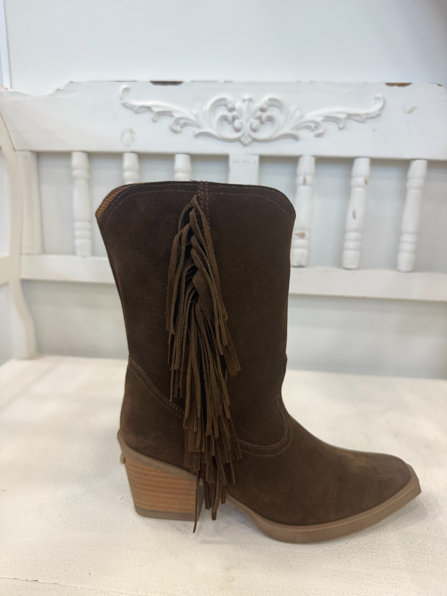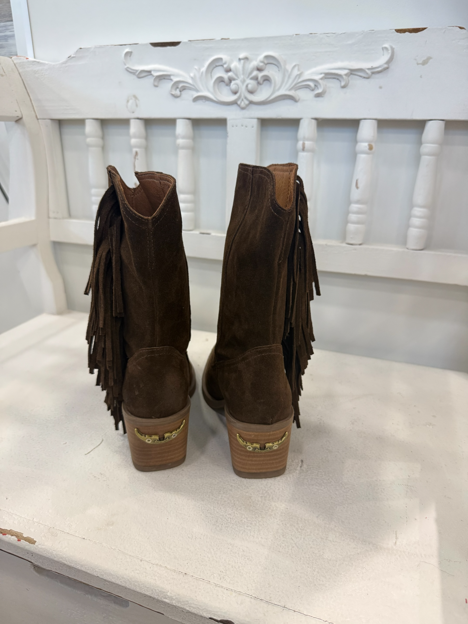 Botín de piel de media caña con flecos en el lateral derecho e izquierdo en color marrón chocolate.