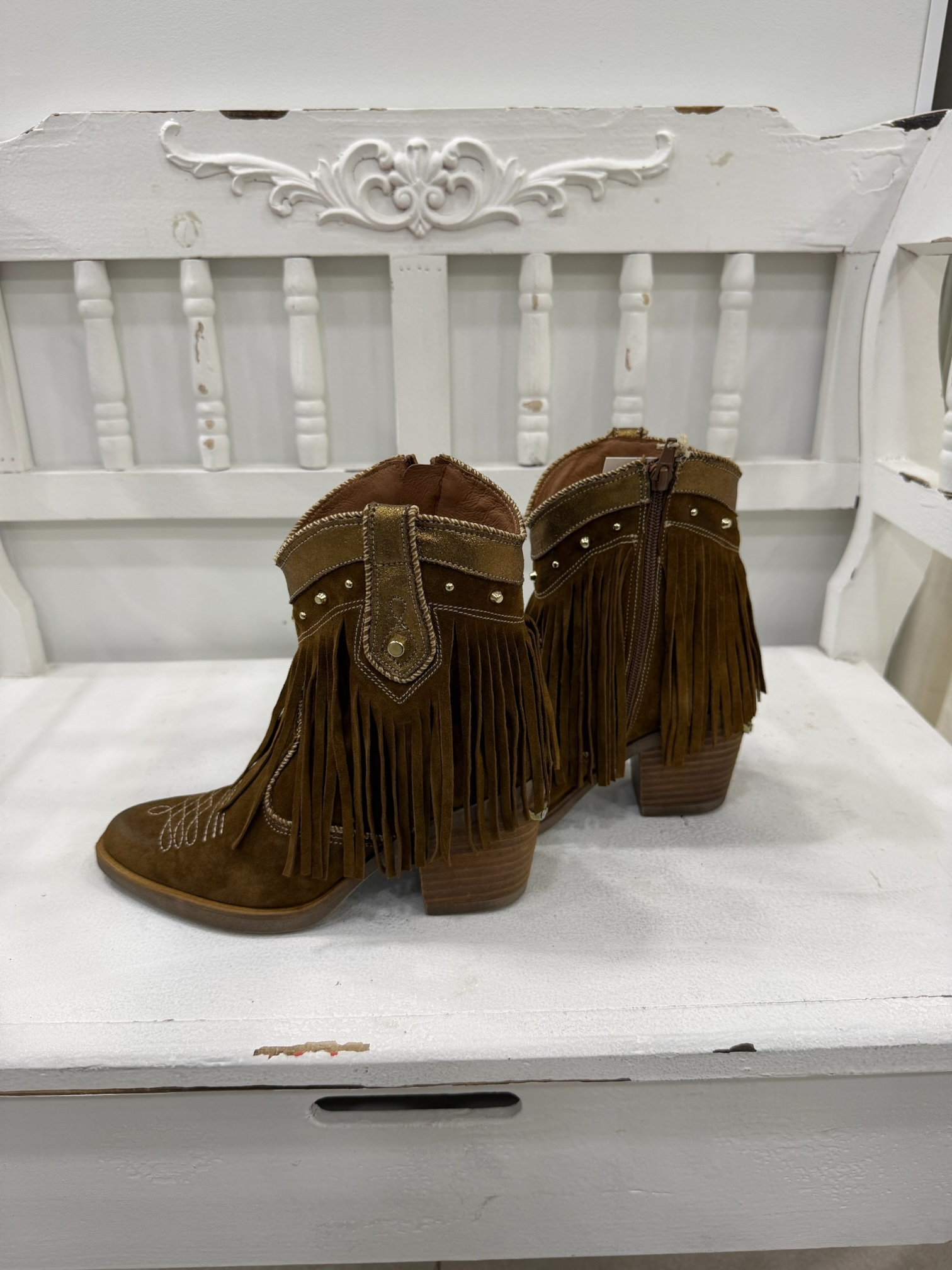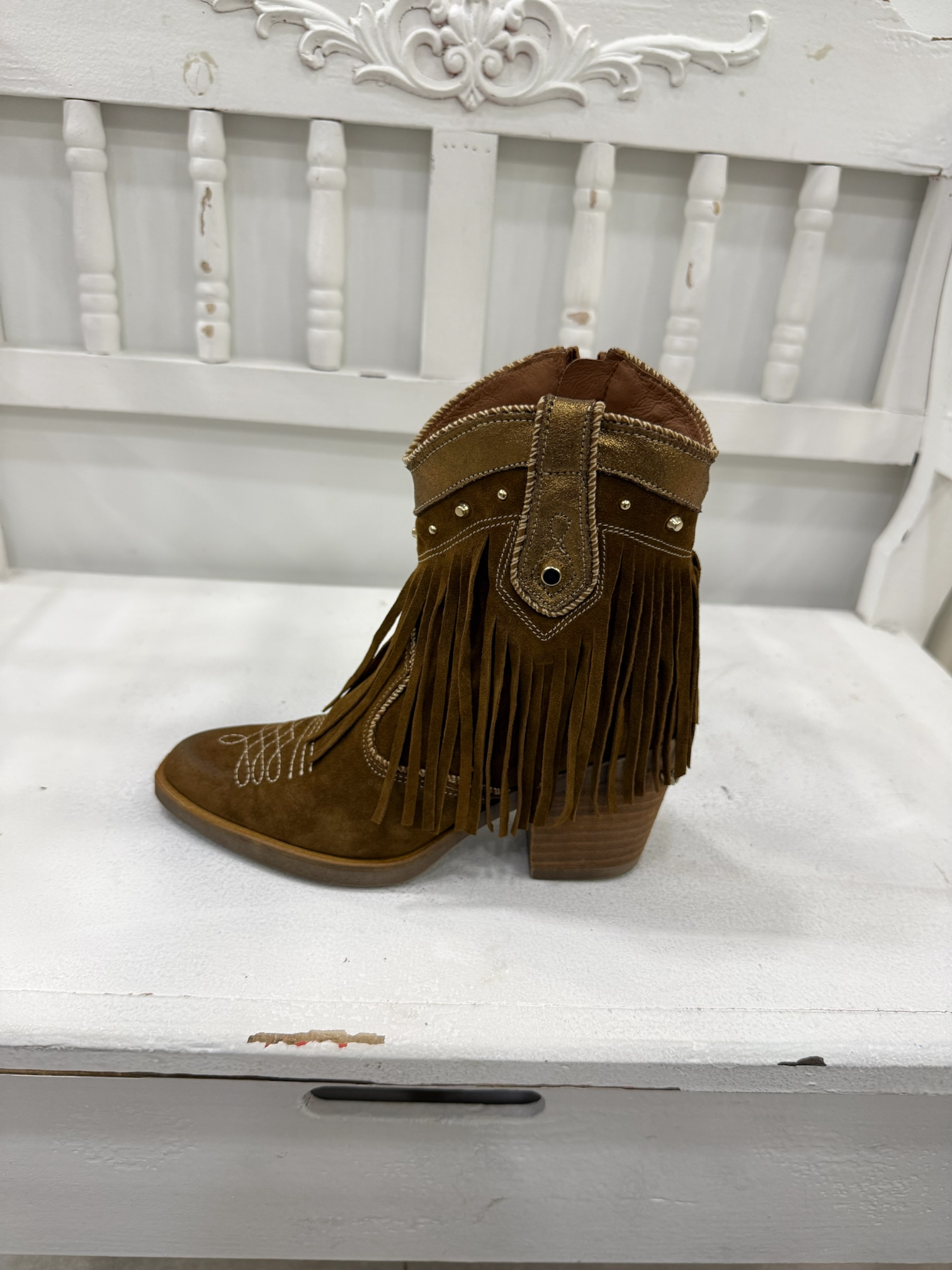 Botines cowboy Boho chic de piel en color marrón combinado con detalles en piel en cobre en la parte de arriba y con unas pequeñas tachas en dorado, con forma en V por la parte de delante del botín para estilizar la pierna.