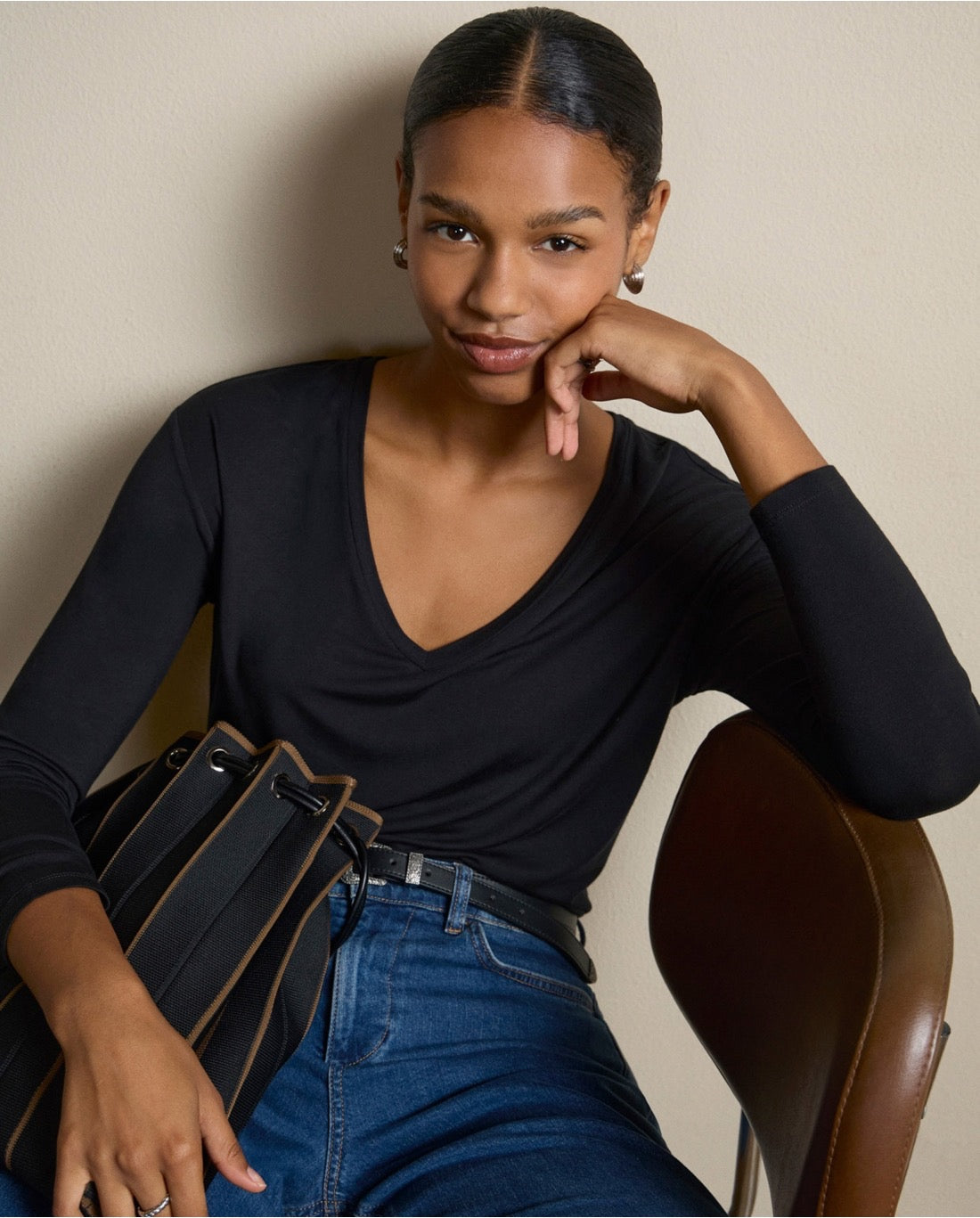 Camiseta de manga larga con escote en pico, confeccionada en viscosa de bambú ultra suave. Una prenda esencial con caída fluida y tejido elástico que aporta libertad de movimiento. Perfecta para llevar sola o bajo una chaqueta.