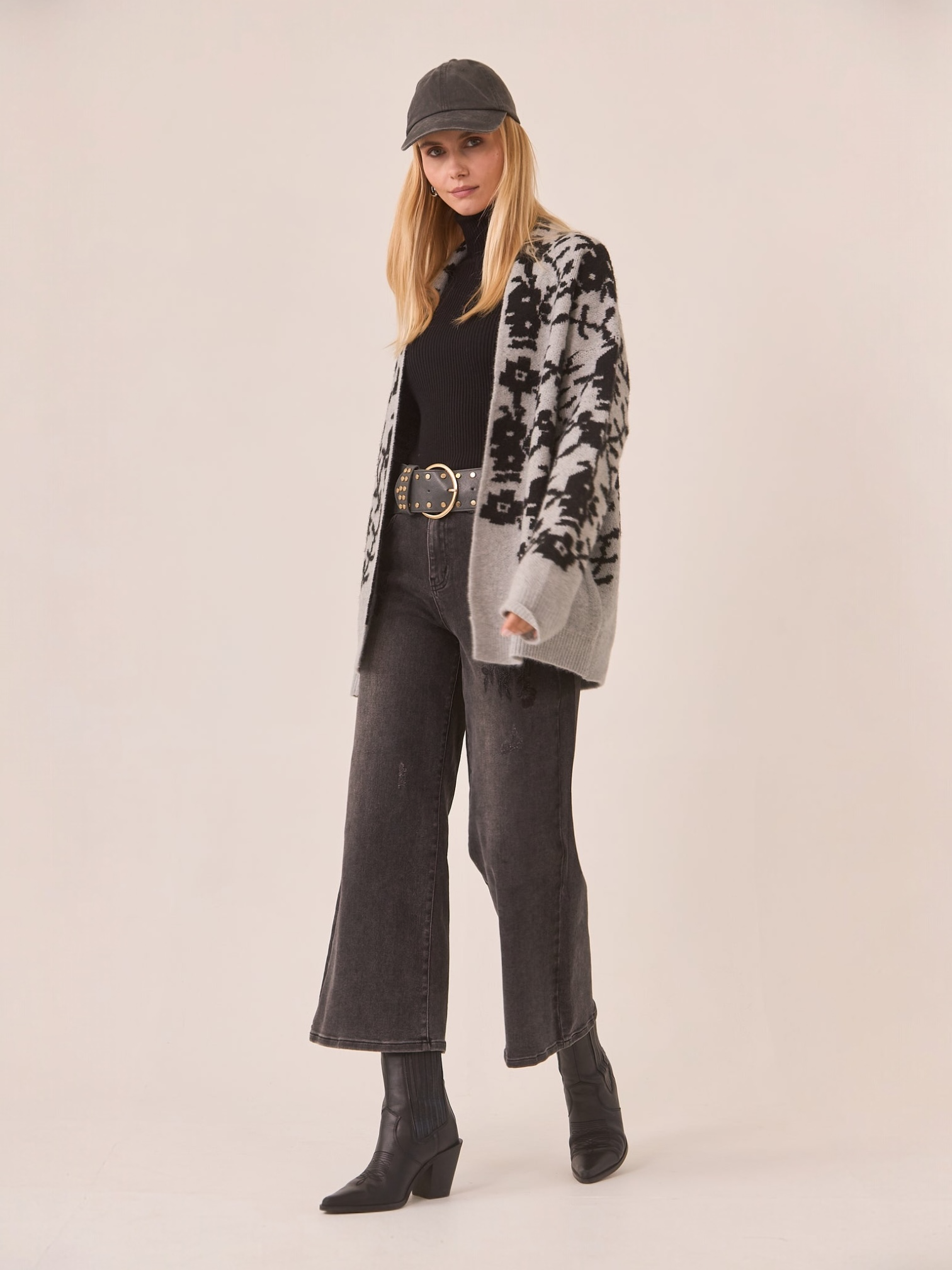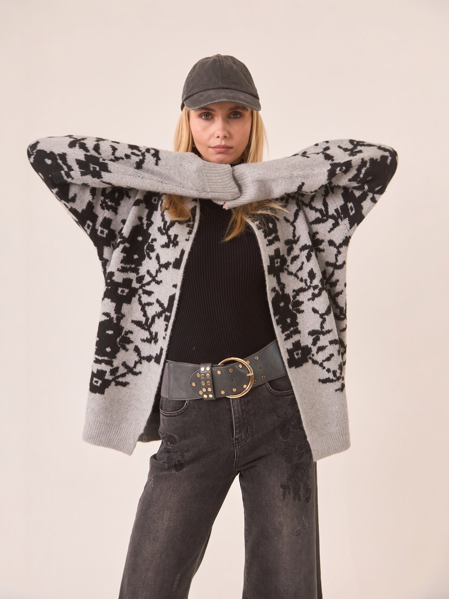 Cárdigan en tejido jacquard en contraste de color. Abierto, sin cierre.