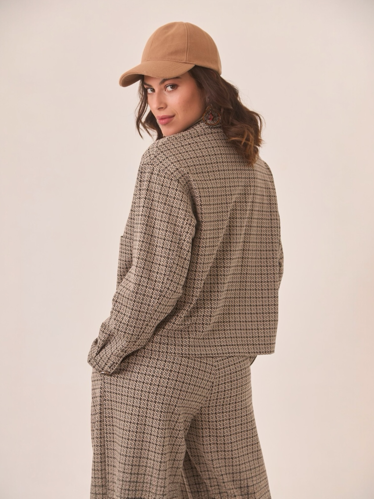 Chaqueta estampada pata de gallo con bolsillos. Cuello de solapas. Botonadura completa frontal.