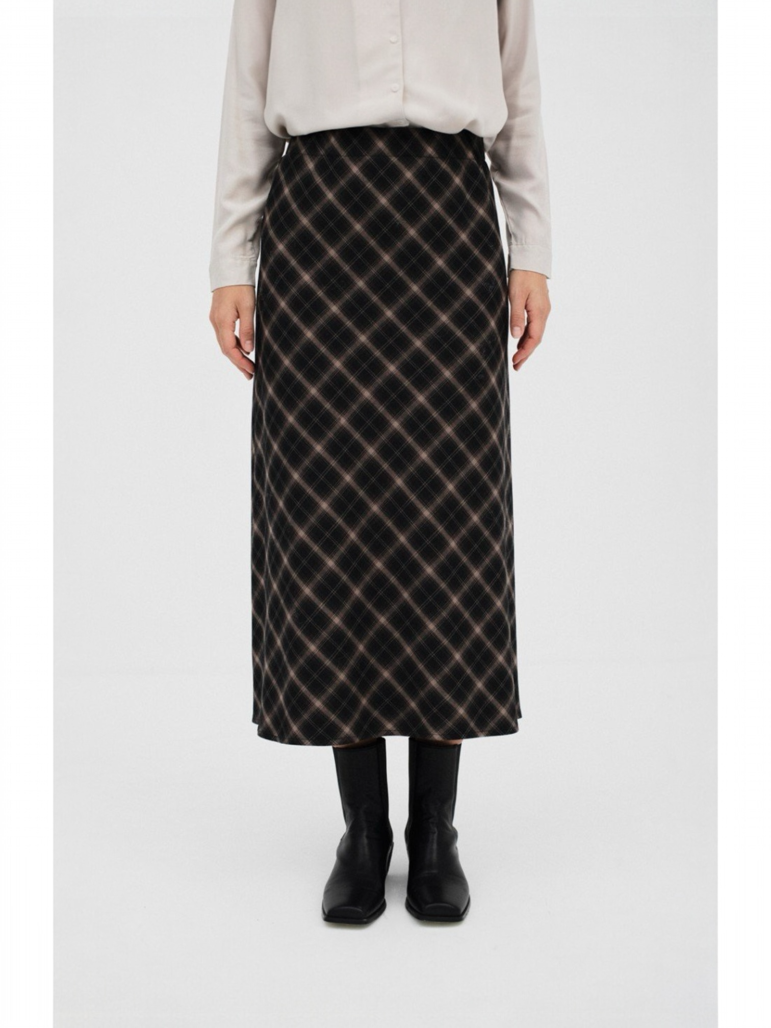 Downtown es una falda midi al bies con un elegante diseño de cuadros. Tiene cierre con cremallera invisible y goma plana en la espalda, perfecta para un look versátil y sofisticado.
