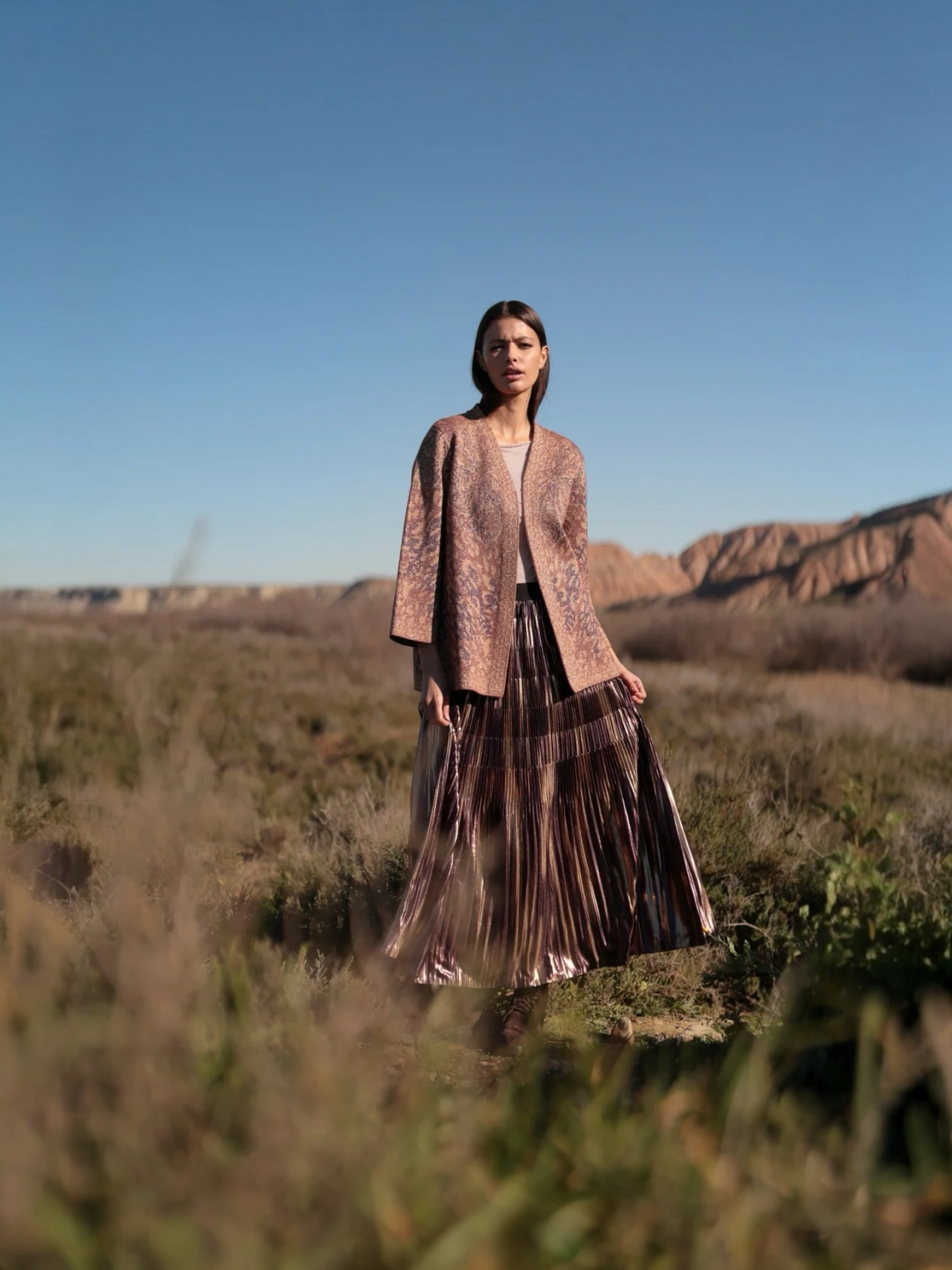 Descubre la elegancia con la falda Oiz. Confeccionada en un tejido plisado de acabado metálico, esta falda con detalles dorados captura la luz con cada movimiento, evocando la calidez del sol al atardecer sobre las montañas.