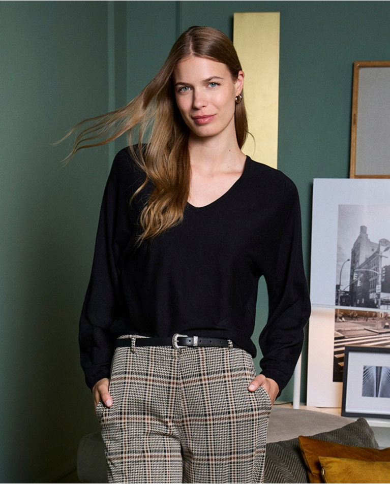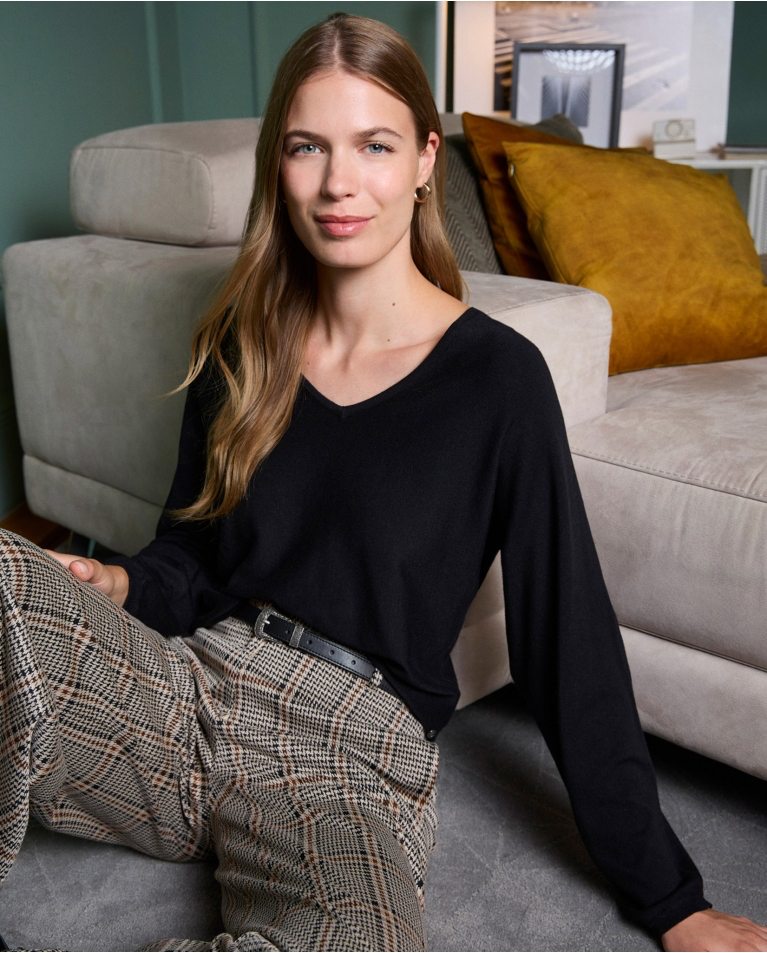 Jersey de viscosa fina con escote en V muy abierto y manga japonesa. Su caída suave y corte fluido aportan comodidad y movimiento, ideal para looks desenfadados con un punto elegante.