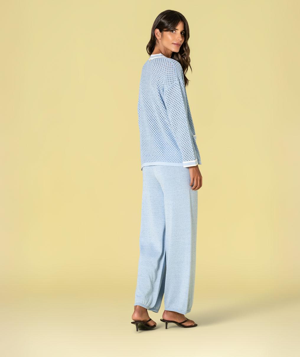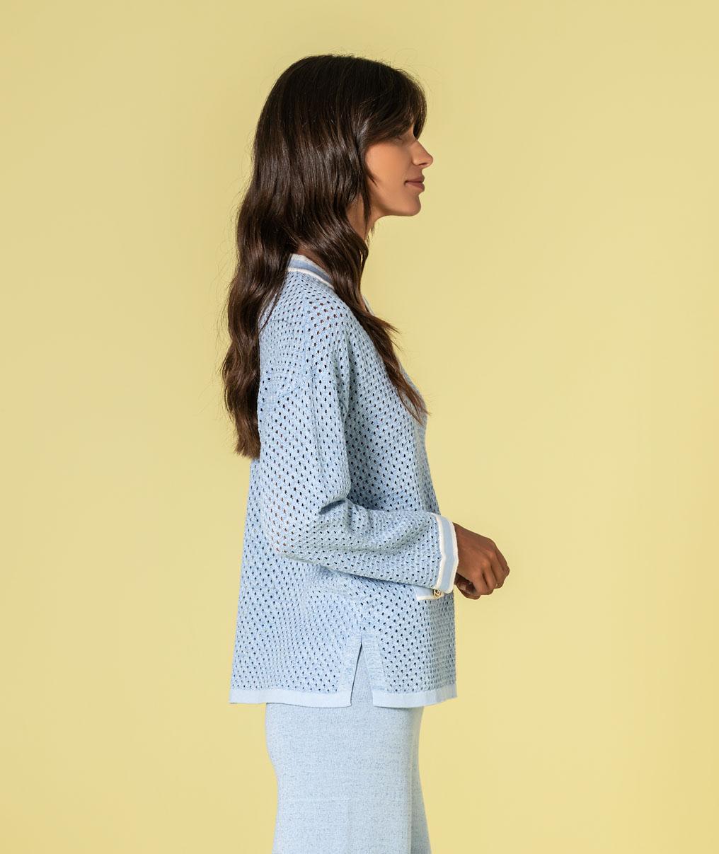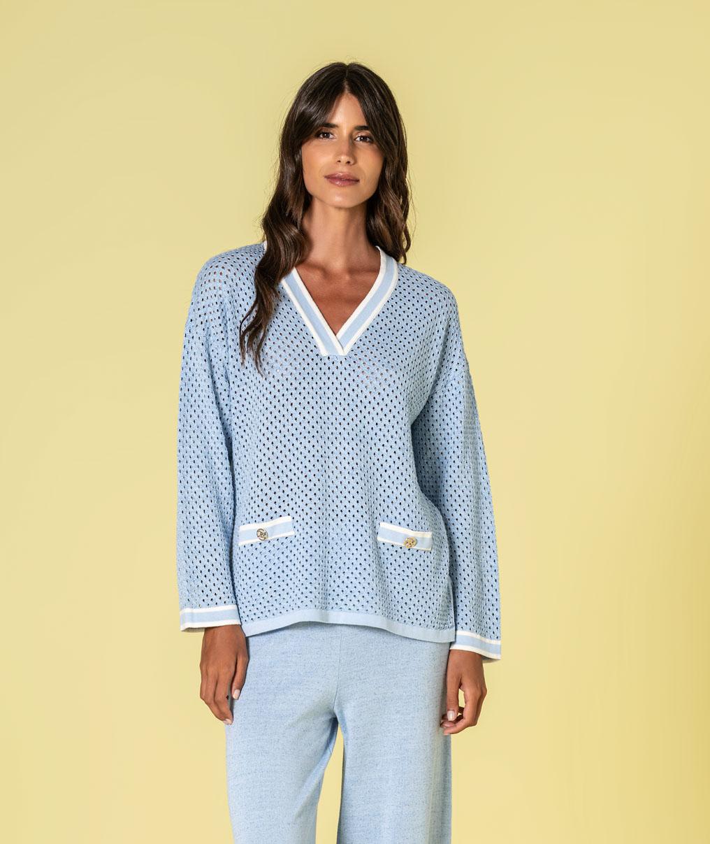Jersey de punto calado con lurex, escote en pico combinado en crudo y celeste y aberturas laterales.