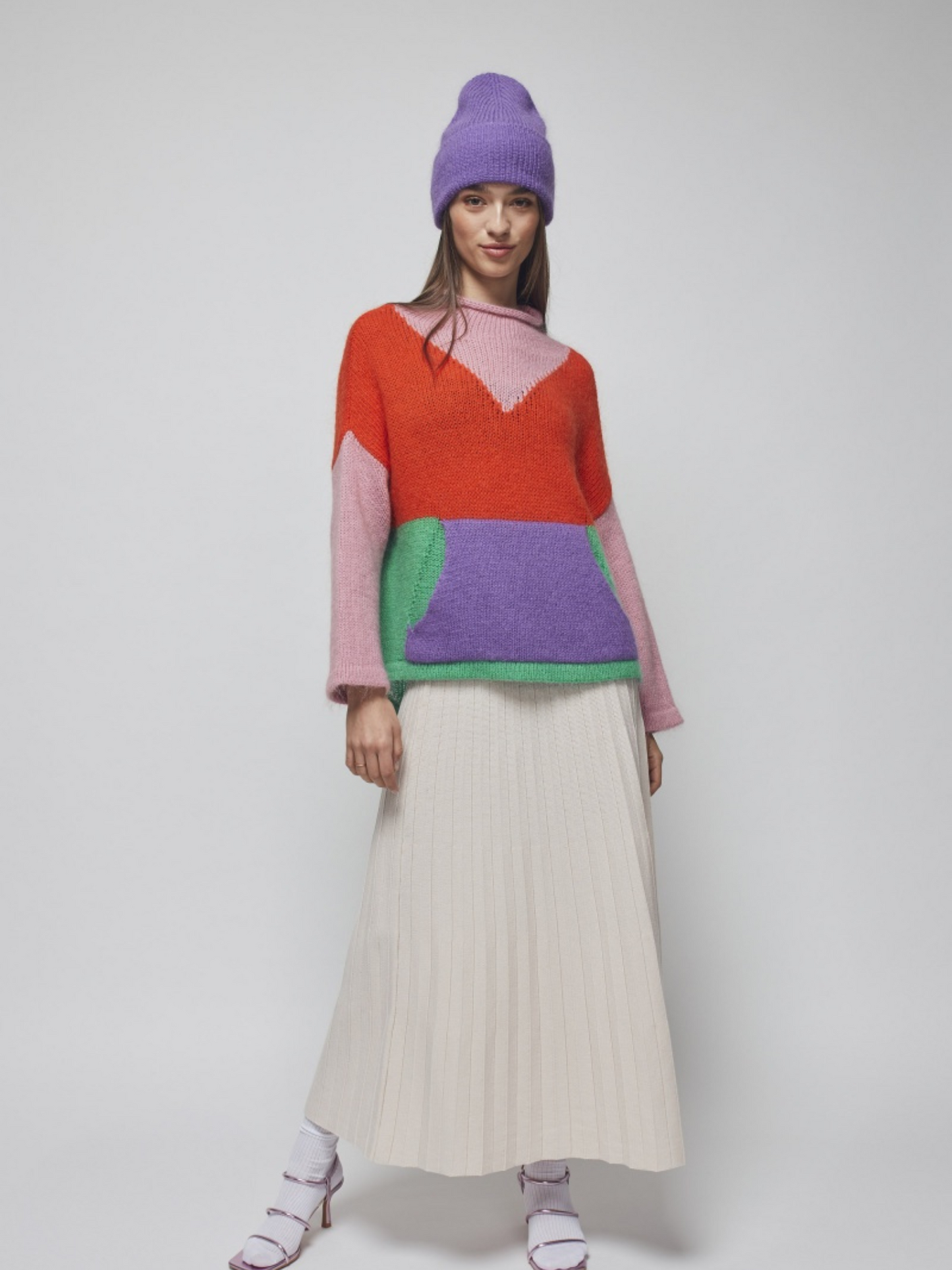 Jersey de punto con diseño colorblock, bolsillo tipo canguro y manga caída. Cuello rulé y acabados en tubular para mayor comodidad.