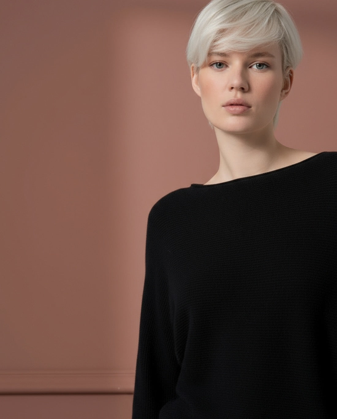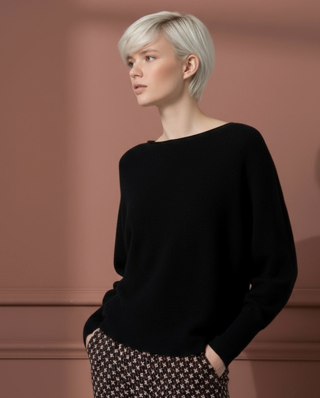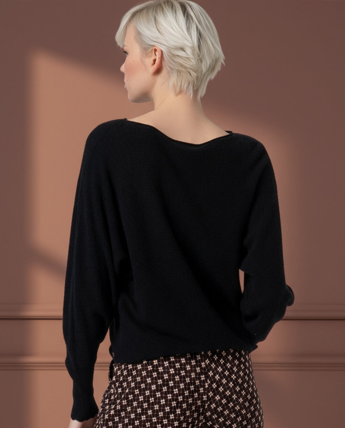 Jersey con cuello redondo y manga abullonada, confeccionado en punto elástico de textura muy agradable. Corte amplio y relajado, ideal para llevar con pantalones o faldas. Un básico actualizado.