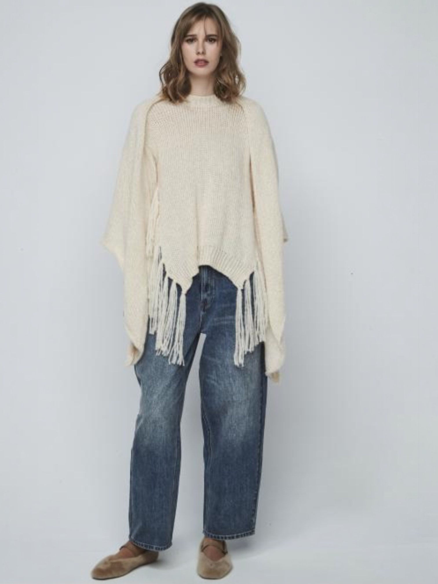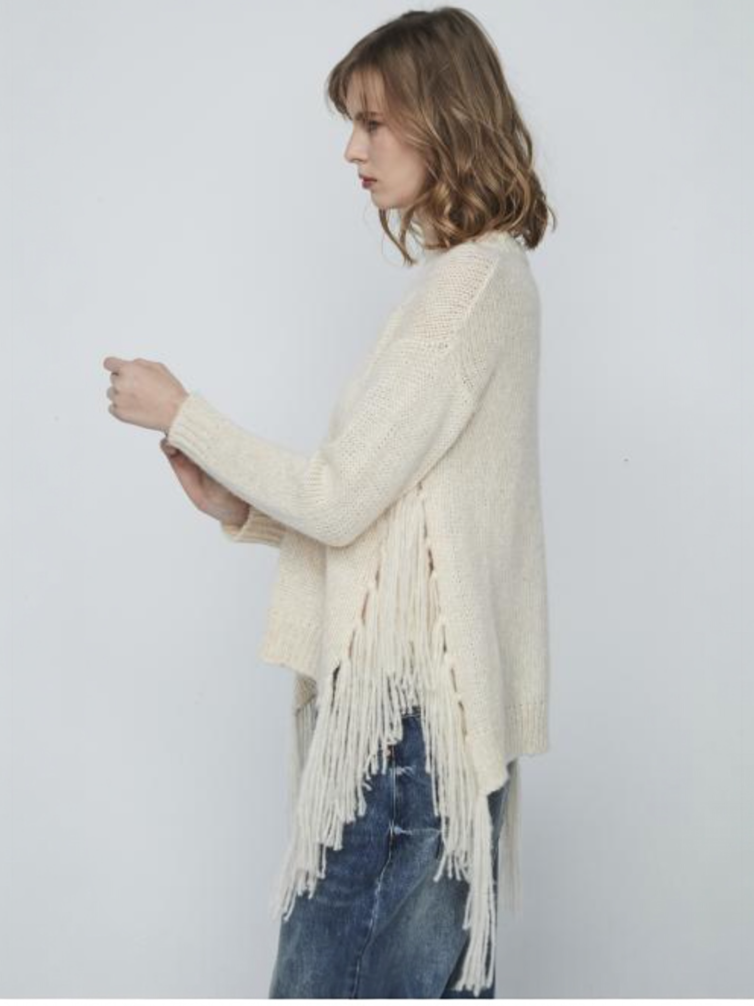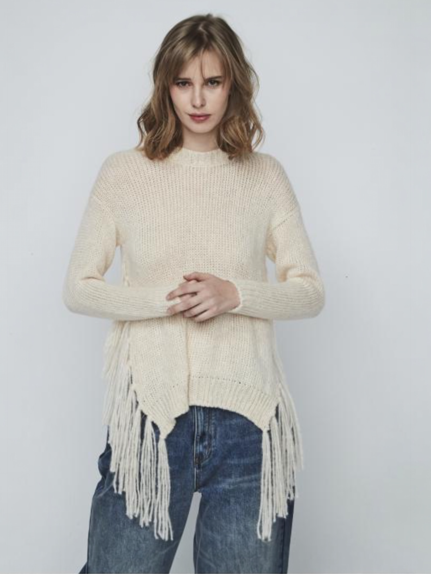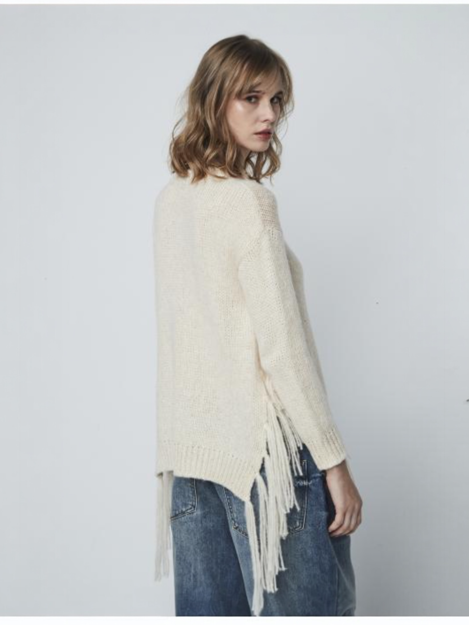 Jersey de punto de manga larga con flecos en los laterales en color beige.