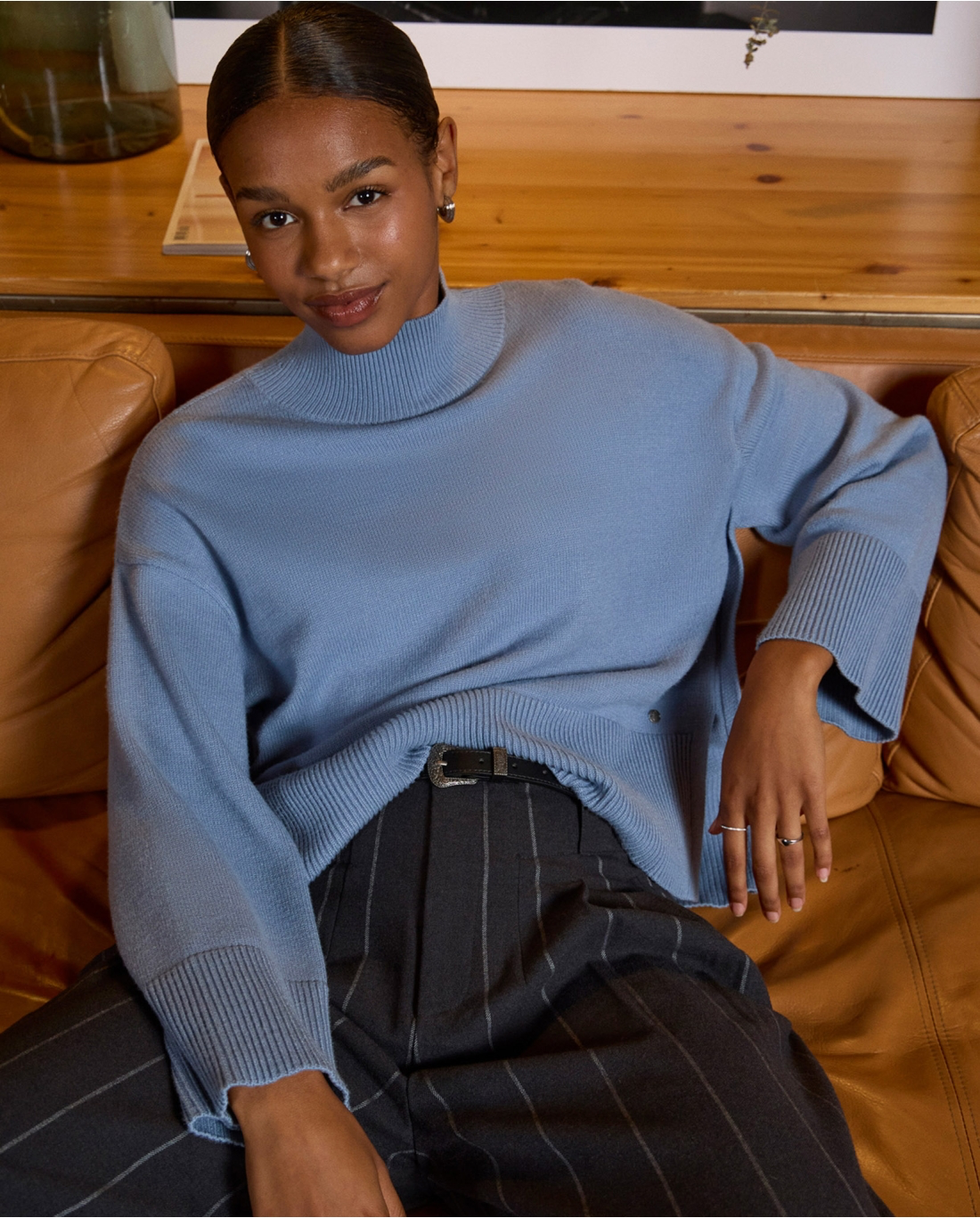 Jersey de punto elástico y muy suave con cuello perkins y manga larga acampanada. Un básico diferente con carácter, perfecto para el día a día, con un fit relajado y favorecedor.
