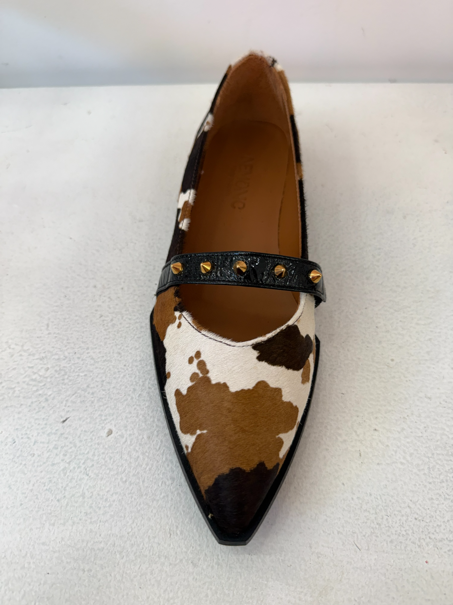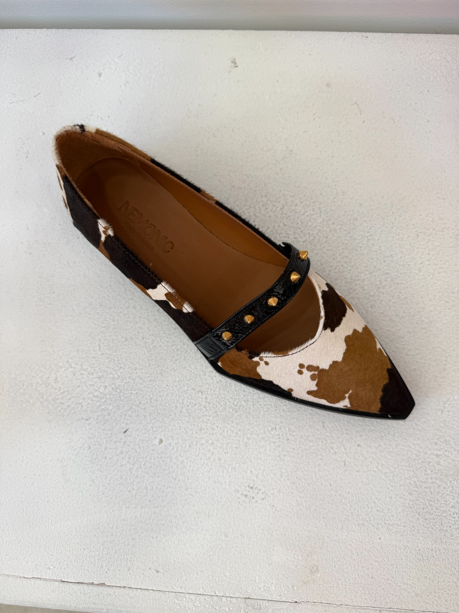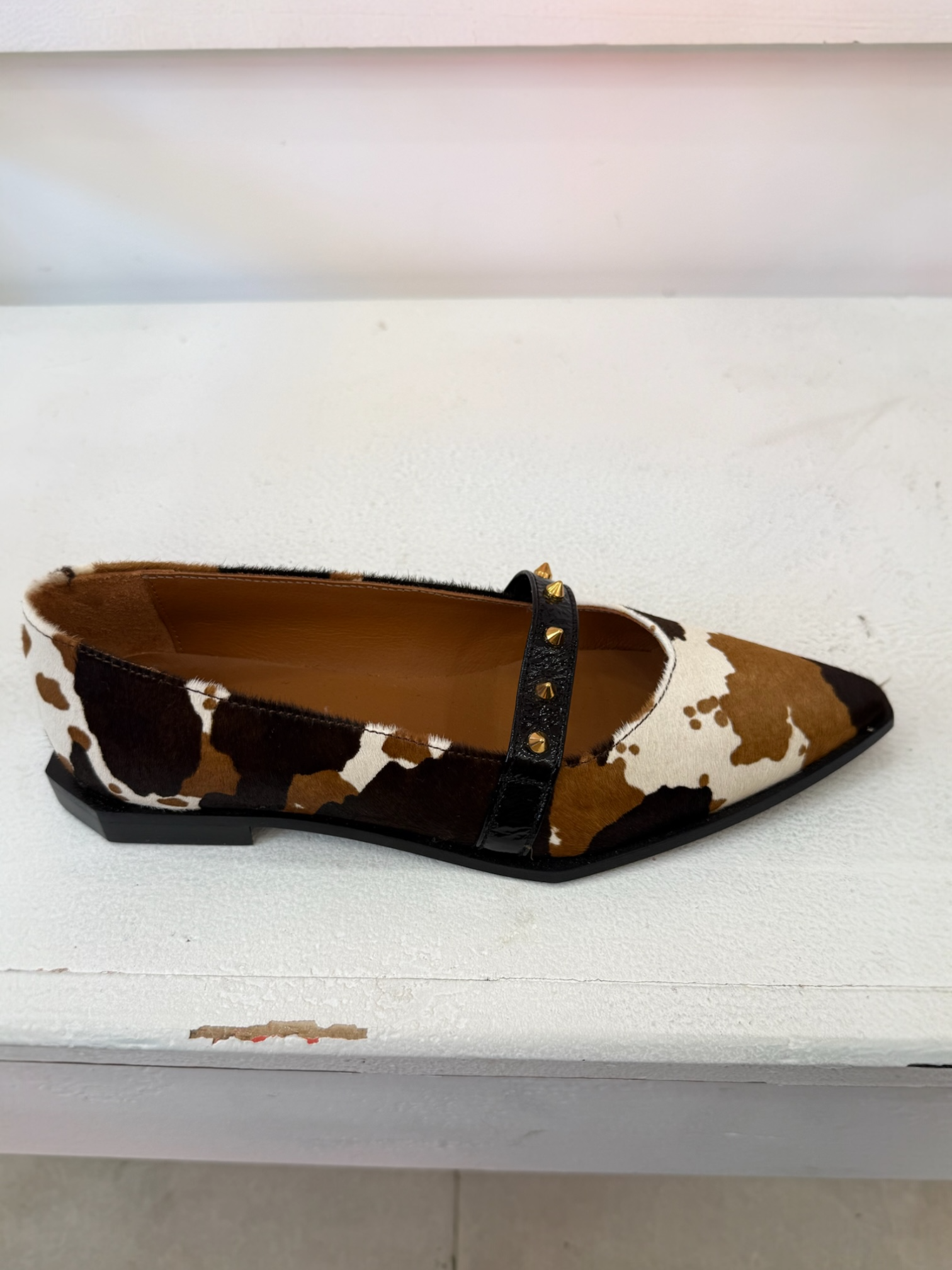 Manoletina de piel en animal print vaca negro, su puntera estrecha con una tira cruzada y detalle de tachas doradas.