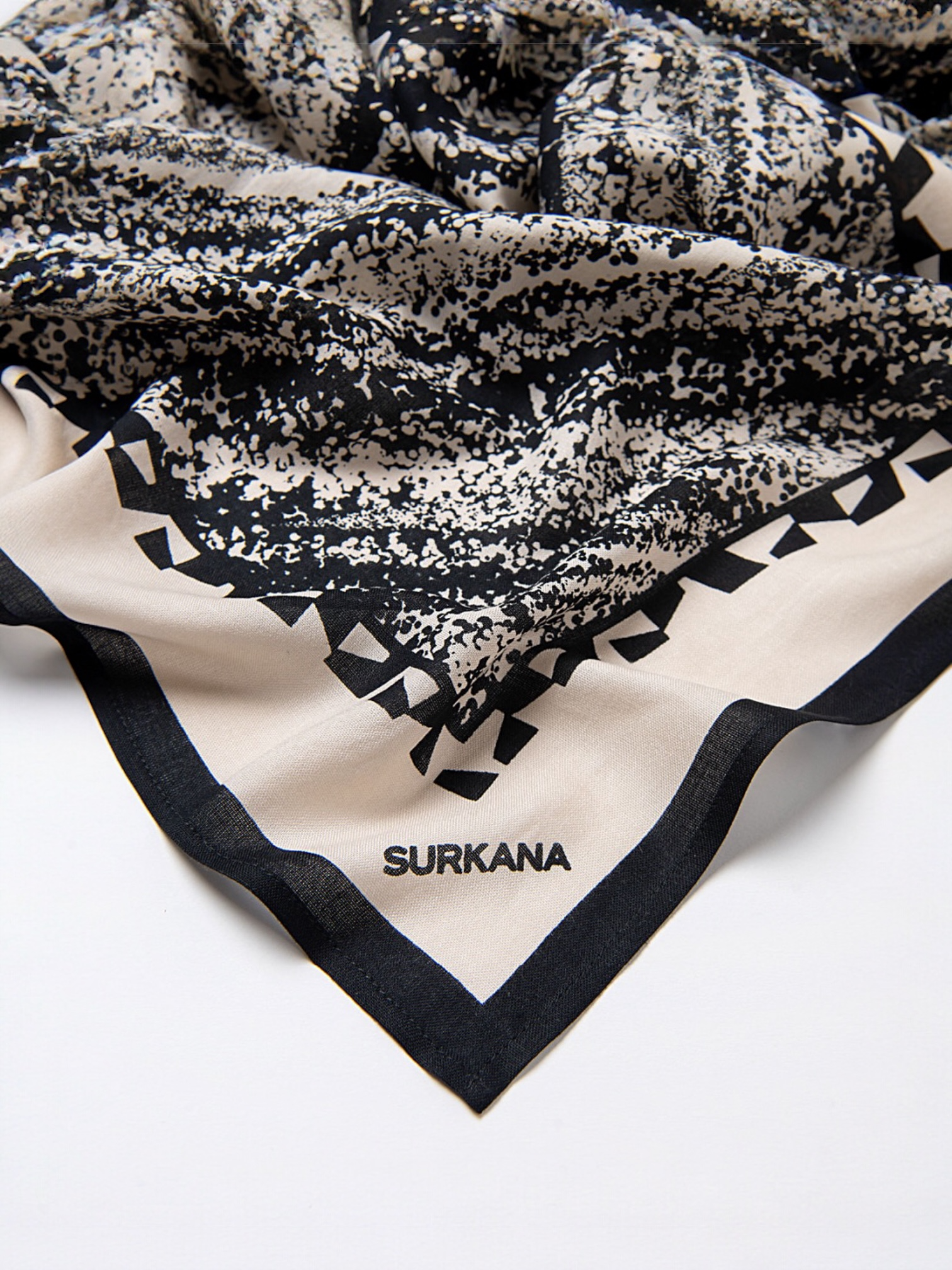 Pañuelo de forma rectangular confeccionado en viscosa twill, un tejido fluido y suave con caída elegante. Presenta estampados originales de la colección con acabado limpio que lo convierte en un complemento sofisticado y fácil de combinar.