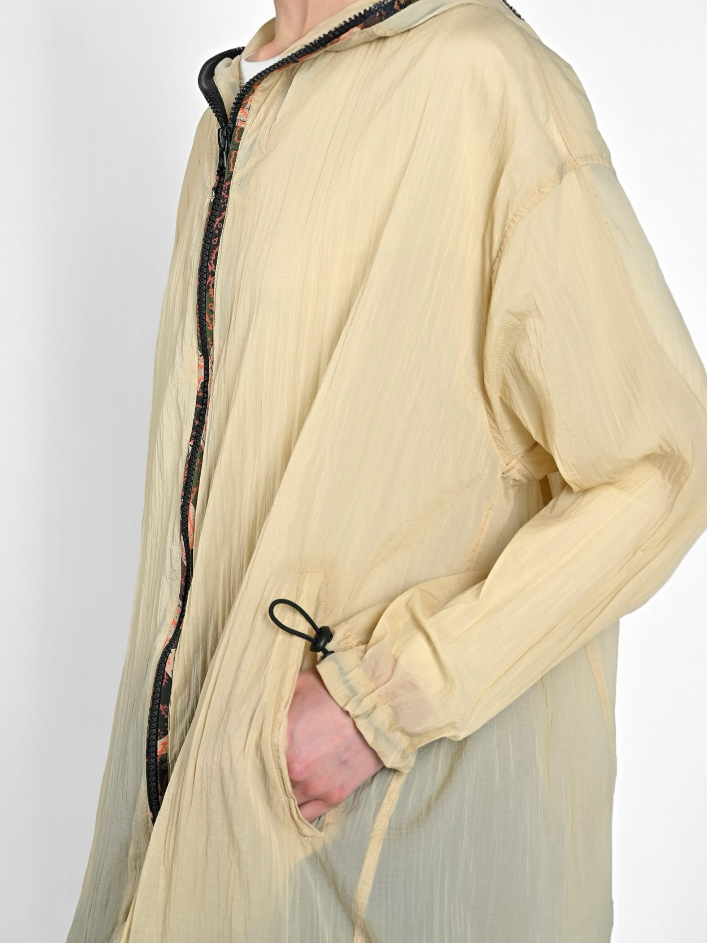 Hecho de 100 por ciento de nailon, es versátil y cómodo. Sus puntos fuertes son muchos: el precioso bordado que decora la espalda, el efecto arrugado, el cierre de cremallera, el dobladillo asimétrico y la práctica capucha lista para ser levantada en caso de necesidad.