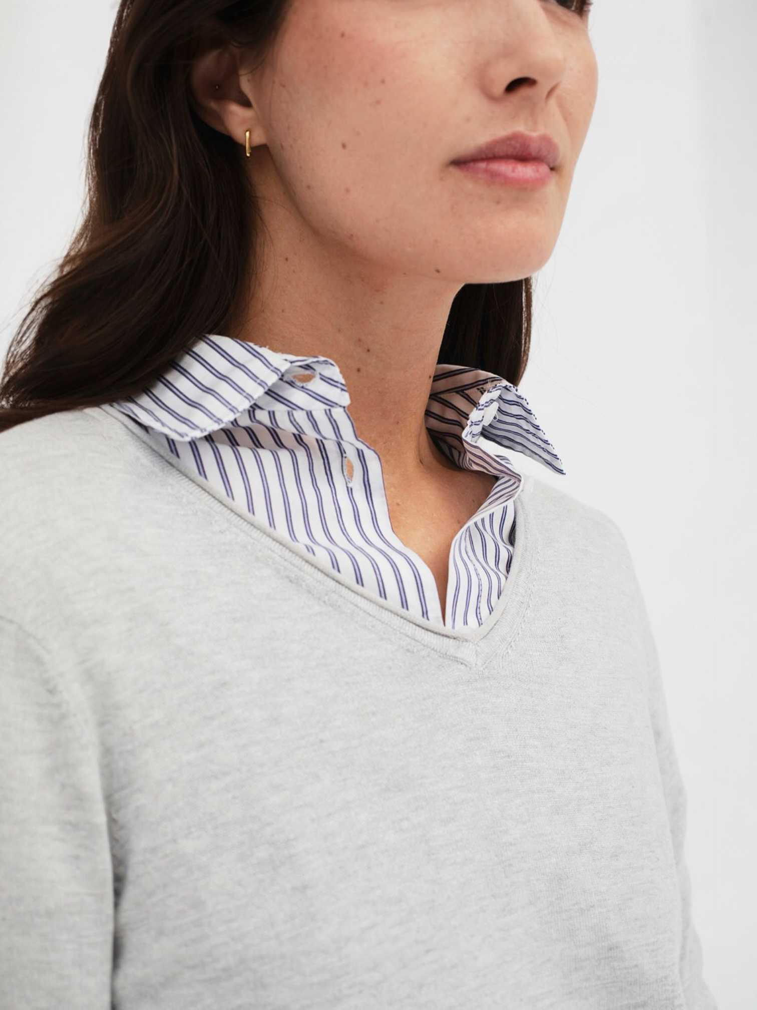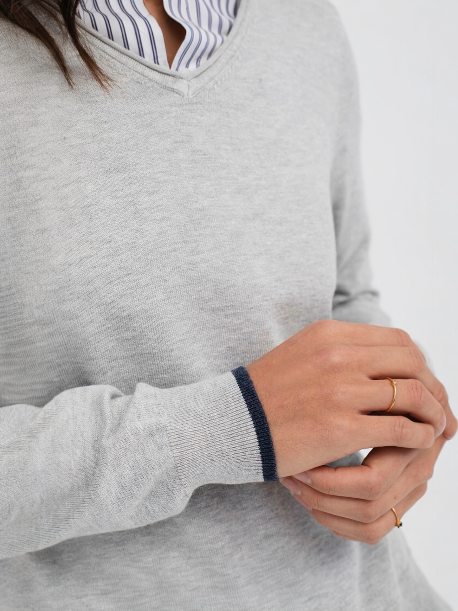 Suéter básico de punto de manga larga con cuello pico. Los puños y el bajo tienen un elegante ribete con color a contraste, que le aporta un estilo moderno y sofisticado. Combina perfectamente con los pantalones Naka.