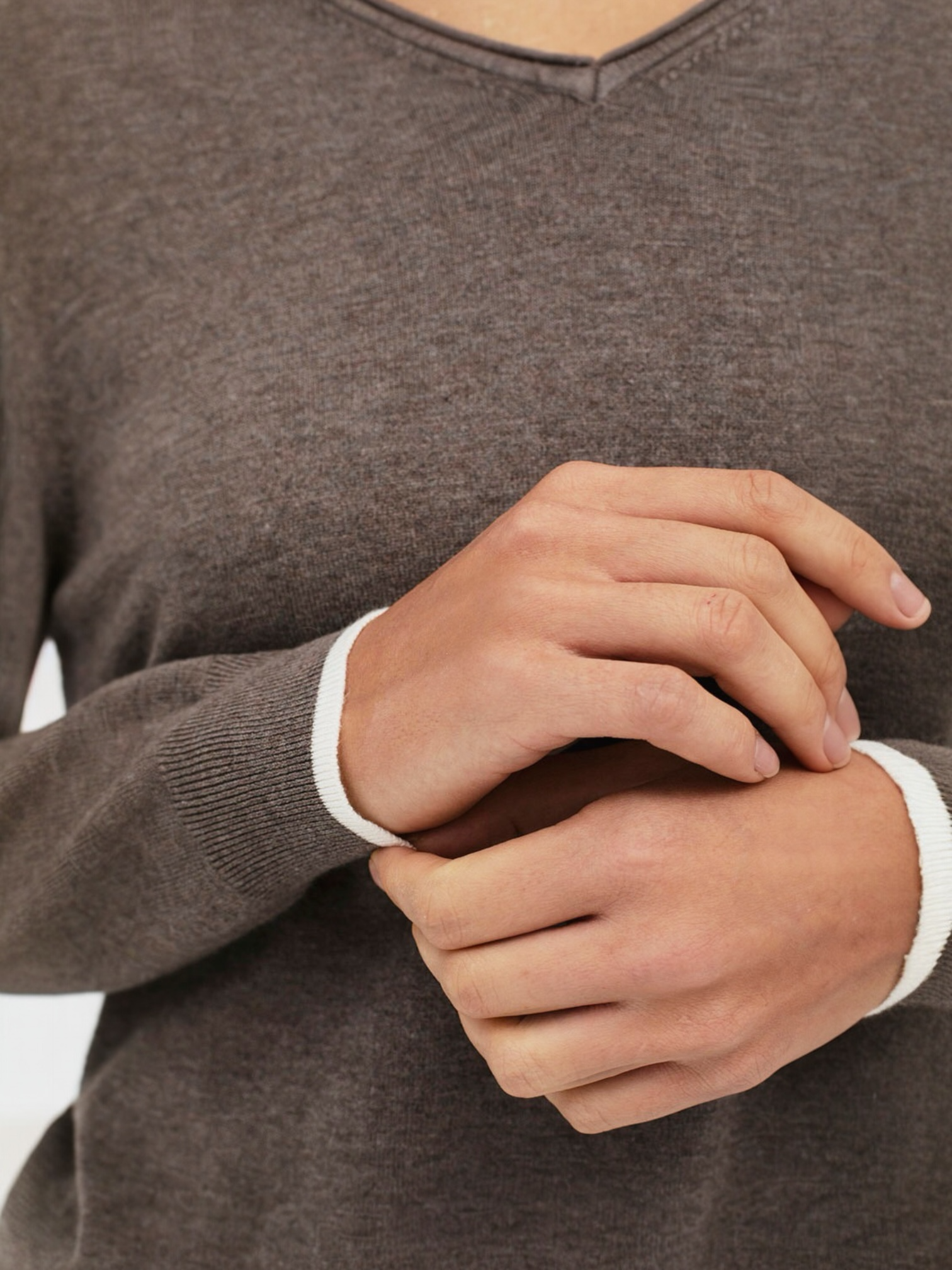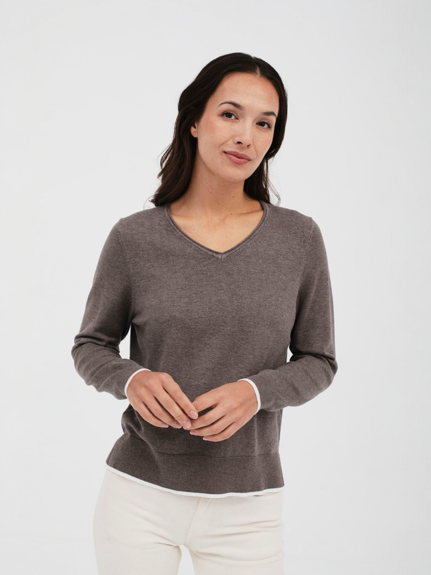 Suéter básico de punto de manga larga con cuello pico. Los puños y el bajo tienen un elegante ribete con color a contraste, que le aporta un estilo moderno y sofisticado. Combina perfectamente con los pantalones Naka.