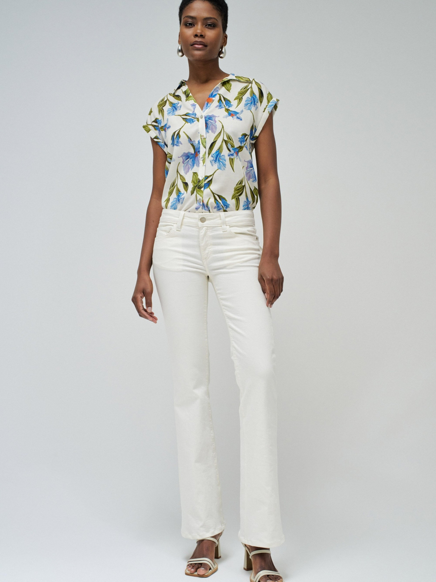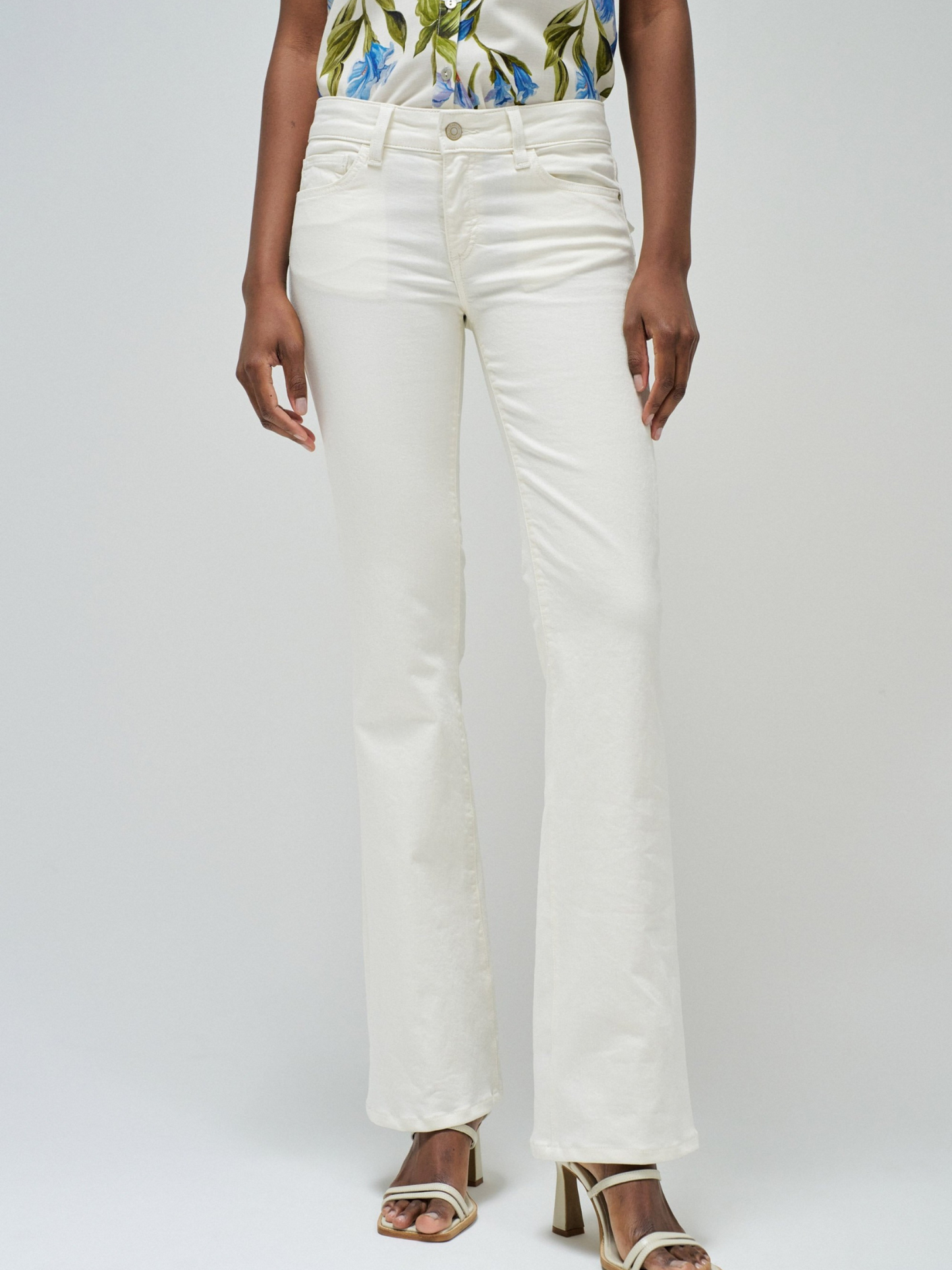 Vaqueros Wonder, color blanco, efecto Push Up, pierna bootcut, tiro bajo, detalle de bolsillos traseros con botones, cinco bolsillos con trabillas, apertura con cremallera.