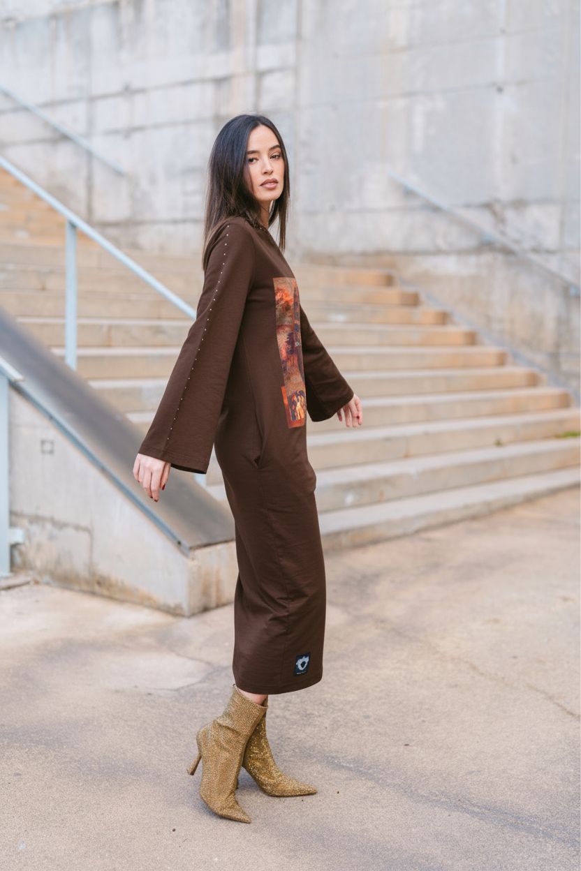 Confeccionado en color marrón chocolate, presenta un corte midi con manga acampada y detalle de tachas en el cuello y a lo largo de las mangas, aportando un toque sofisticado y rebelde a la vez.