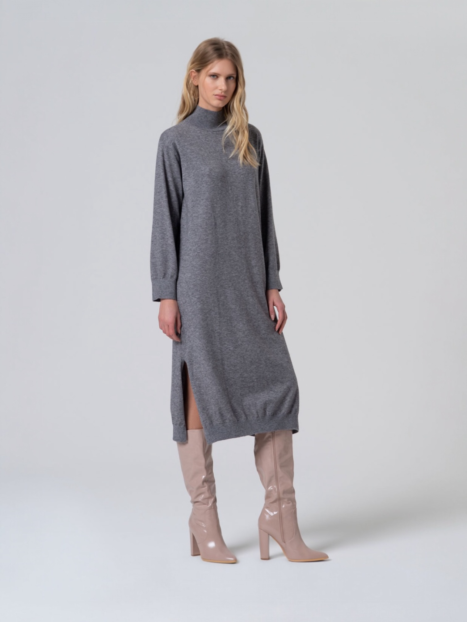 Vestido largo de punto con cuello alto, corte oversize y abertura lateral. Su tejido con mezcla de lana ofrece una gran suavidad y abrigo, ideal para los días fríos. Una prenda cómoda con estilo relajado.