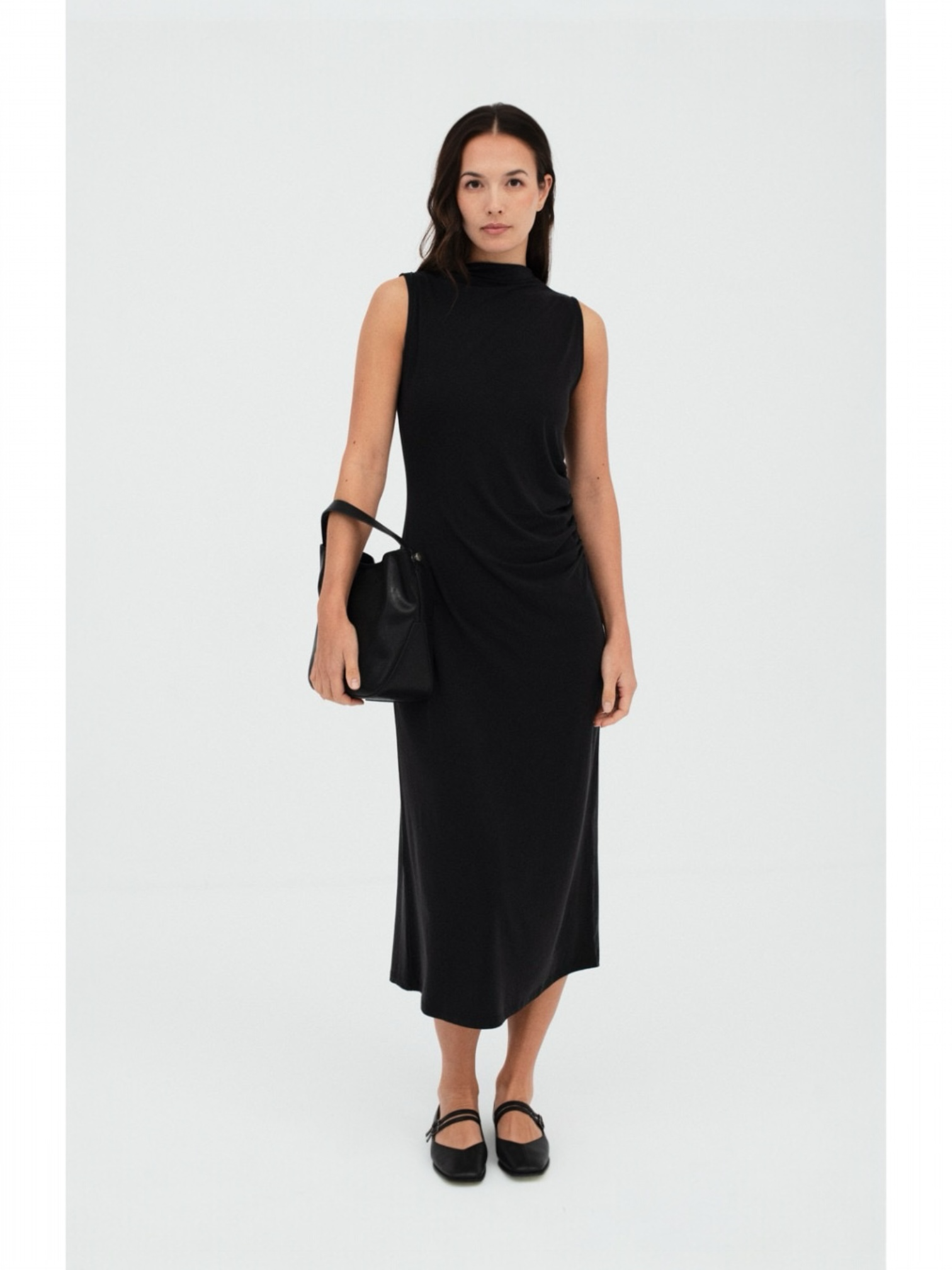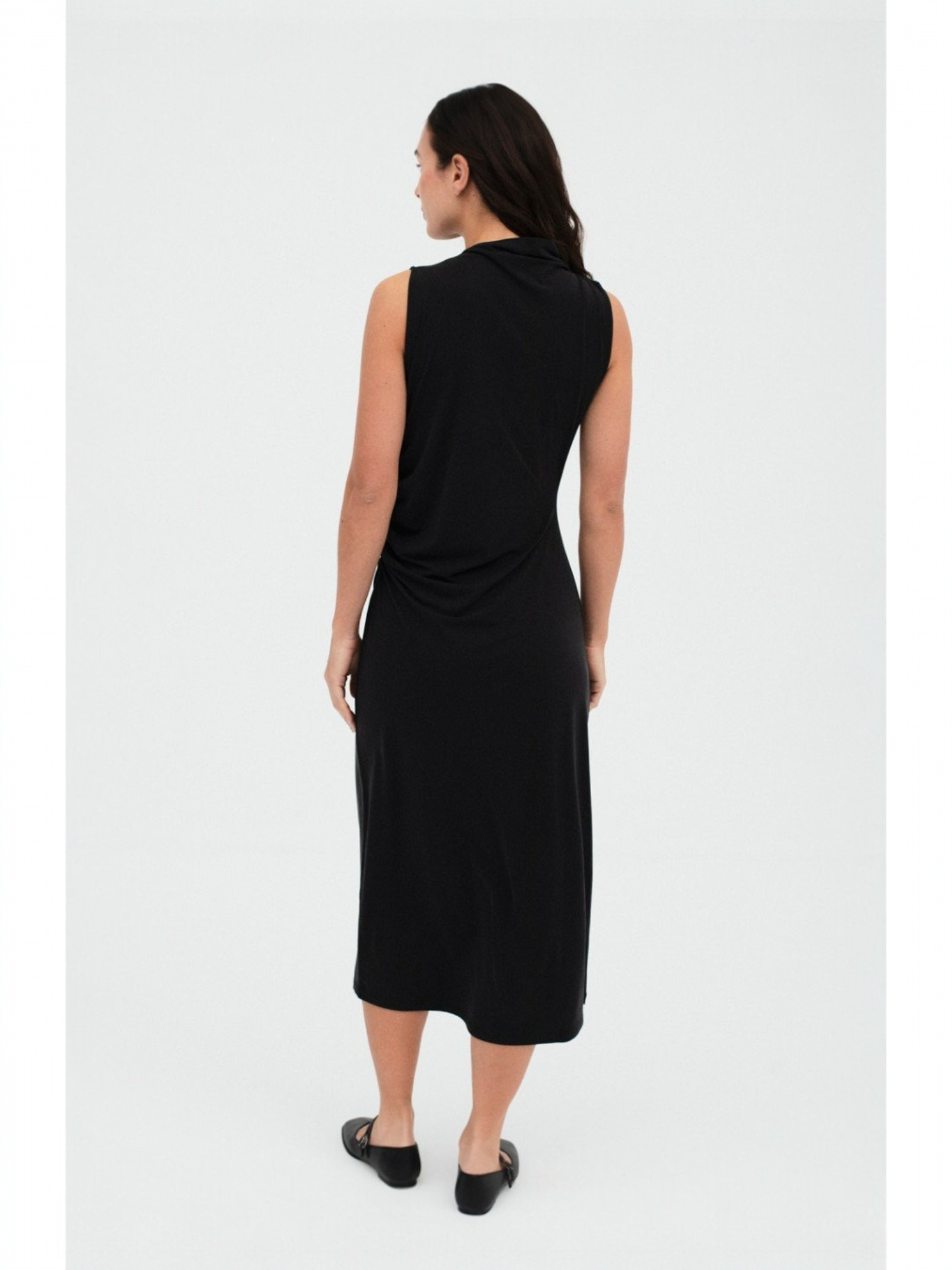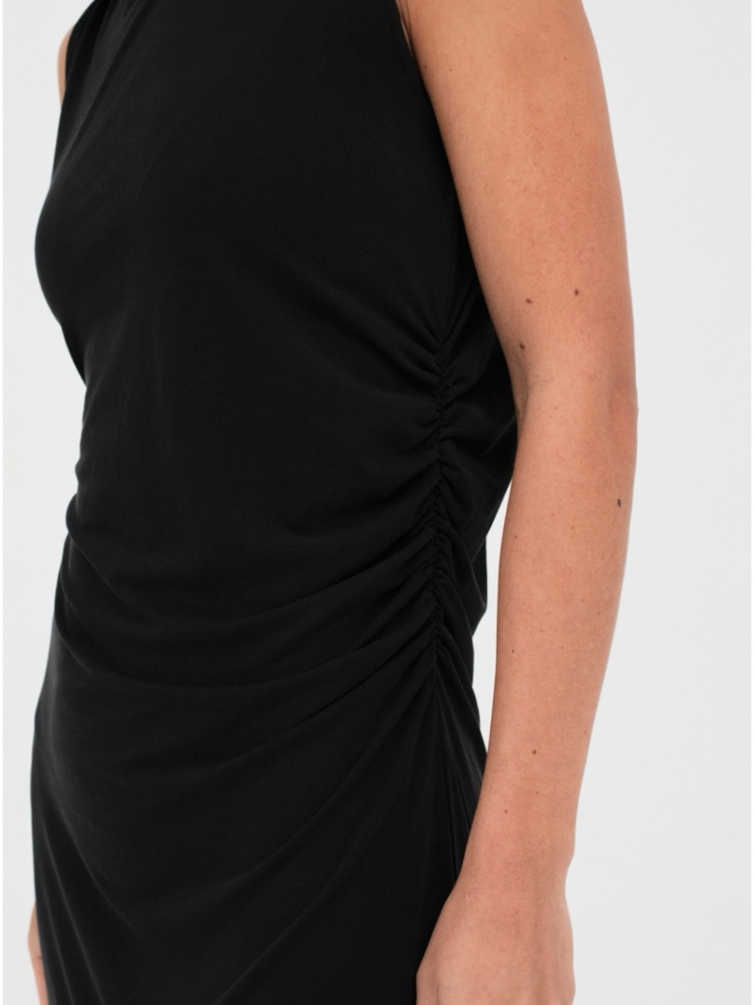Vestido de modal con efecto cupro. Destaca por su escote diagonal y detalles fruncidos en el hombro y la cintura. Perfecto para un look elegante y cómodo con un toque moderno.